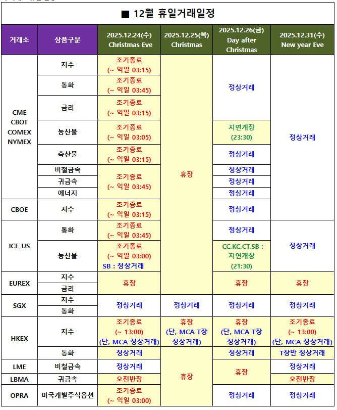 12월 휴일 거래일정 안내 페이지 정보 작성자 최고관리자 작성일 25-12-15 15:13 본문 .참고 목록 이전글1월 휴일 거래일정 안내 26.01.05 다음글2026학년도 대학수학능력시험 매매시간 안내 25.11.13